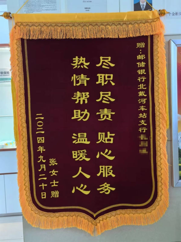 近日,郵儲(chǔ)銀行北戴河車站支行收到客戶張女士送來(lái)的一面錦旗,上面寫(xiě)著“盡職盡責(zé),貼心服務(wù),熱情幫助,溫暖人心”,表達(dá)了客戶對(duì)該行服務(wù)的高度認(rèn)可和贊賞。