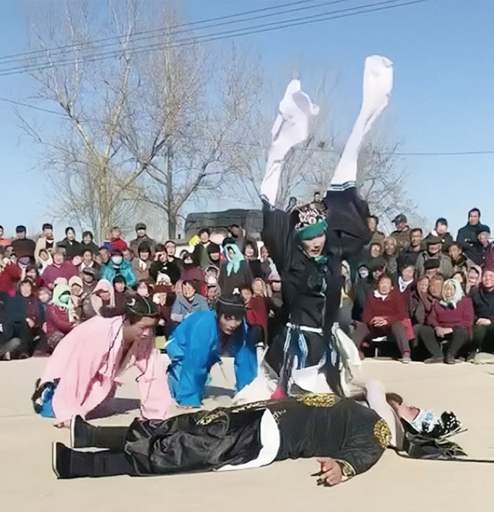 宋建亮(上)表演地秧歌與武術(shù)相結(jié)合的動(dòng)作疊羅漢。