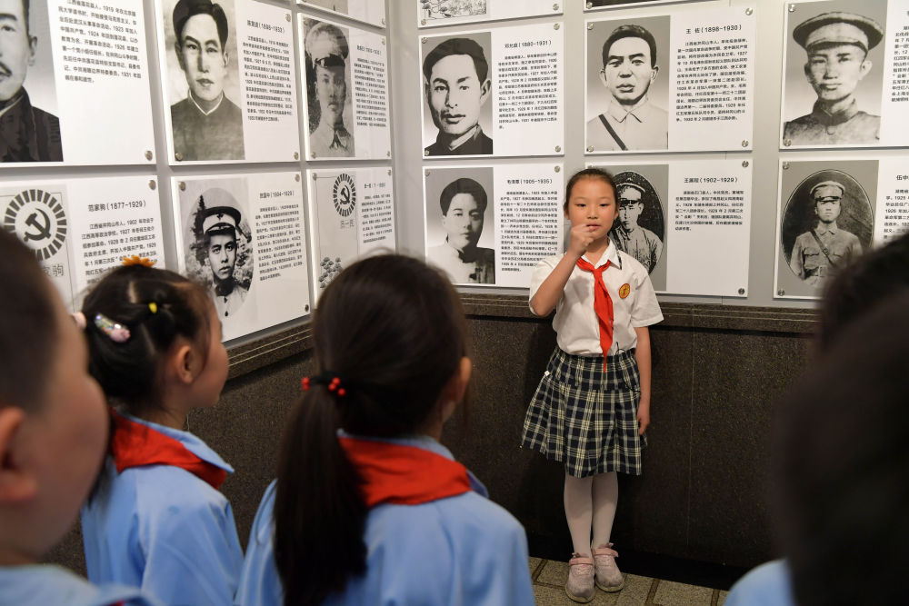 2021年5月12日,在井岡山革命烈士陵園,“小紅軍宣講團”的成員周煜菡給前來參觀研學(xué)的學(xué)生們進行義務(wù)講解。井岡山小學(xué)把“紅色德育”作為立德樹人的重要抓手,成立了“小紅軍宣講團”,培養(yǎng)了一批講好紅色故事、傳承先輩精神的小小義務(wù)講解員。
