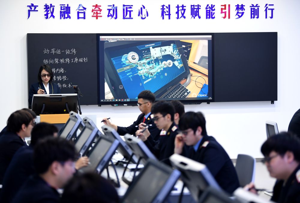 2022年4月29日,在西安鐵路職業(yè)技術(shù)學(xué)院,學(xué)生在動車組VR智慧課堂上模擬檢修。近年來,我國著力促進教育公平,提升教育質(zhì)量,加快推進教育現(xiàn)代化,教育數(shù)字化工作持續(xù)推進、成果豐碩。