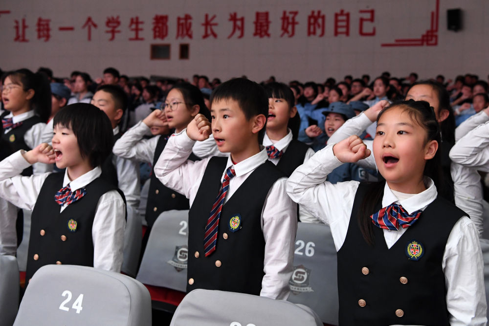 2024年11月13日,在“中流砥柱——中國共產(chǎn)黨抗戰(zhàn)文物展校園巡展”活動上,北京市第四中學(xué)順義分校學(xué)生們共同宣誓,傳承紅色基因,接受愛國教育。該巡展把中國人民抗日戰(zhàn)爭紀念館的館藏資源搬進北京中小學(xué)校園,打造流動博物館和紅色思政課堂。