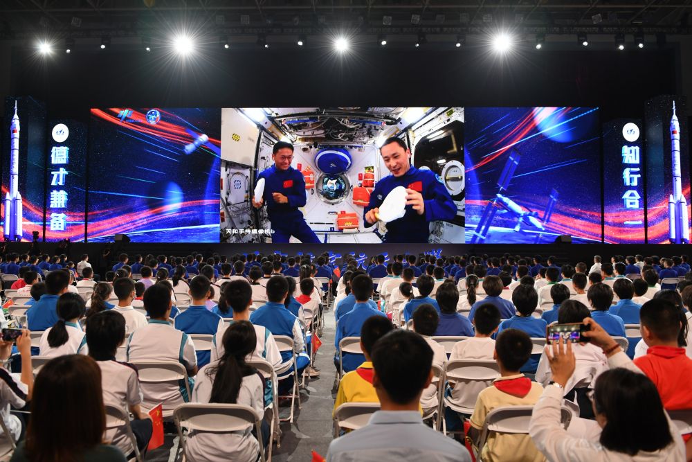 2023年9月21日,在北京航空航天大學(xué),學(xué)生收看“天宮課堂”第四課。神舟十六號航天員景海鵬、朱楊柱、桂海潮在軌展示介紹中國空間站夢天實驗艙工作生活場景,演示球形火焰實驗、奇妙“乒乓球”實驗、動量守恒實驗以及又見陀螺實驗,并與地面課堂進行互動交流。