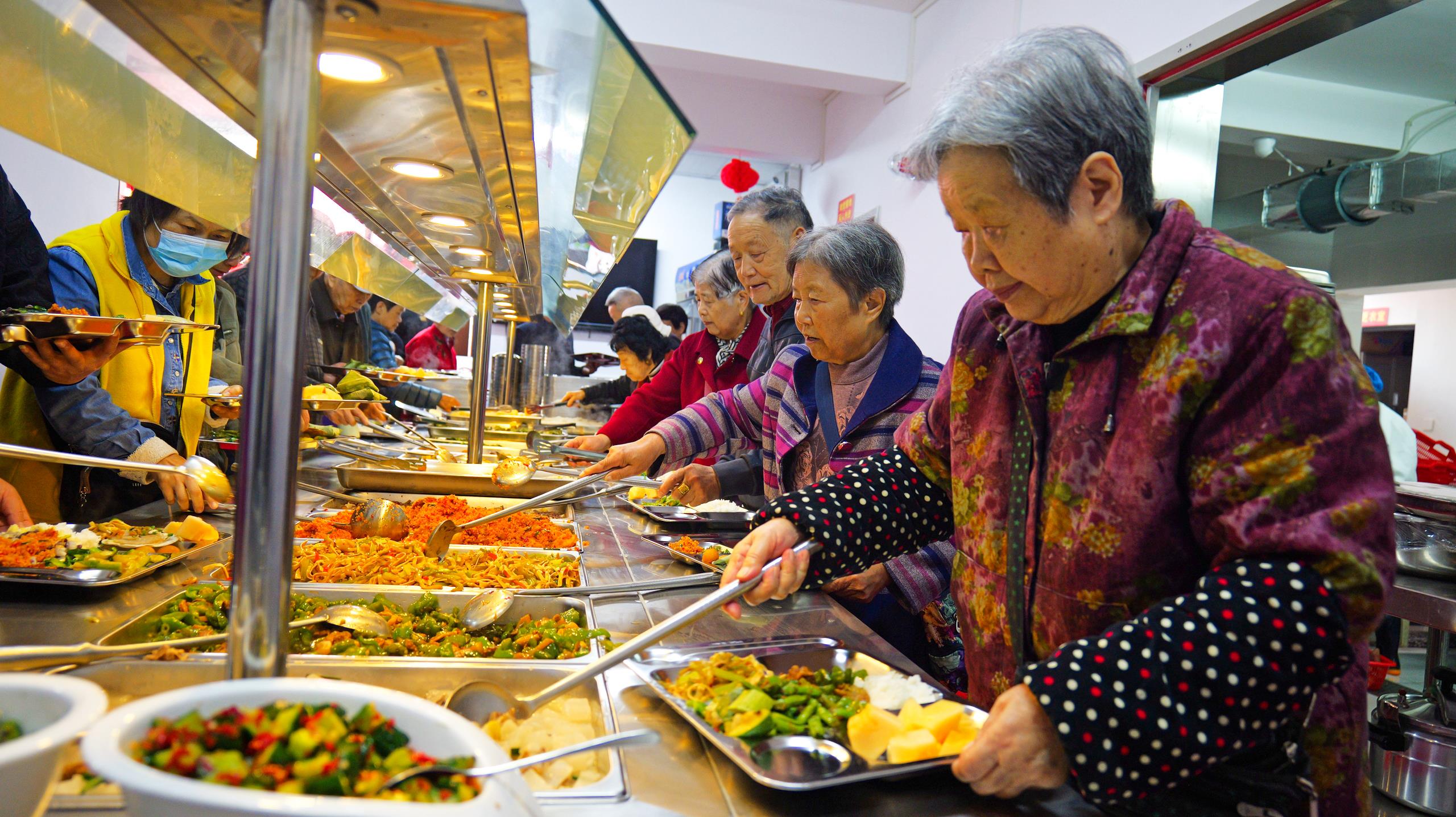 △湖北恩施一社區(qū)“幸福食堂”里,社區(qū)老人、退休職工在排隊(duì)取餐。