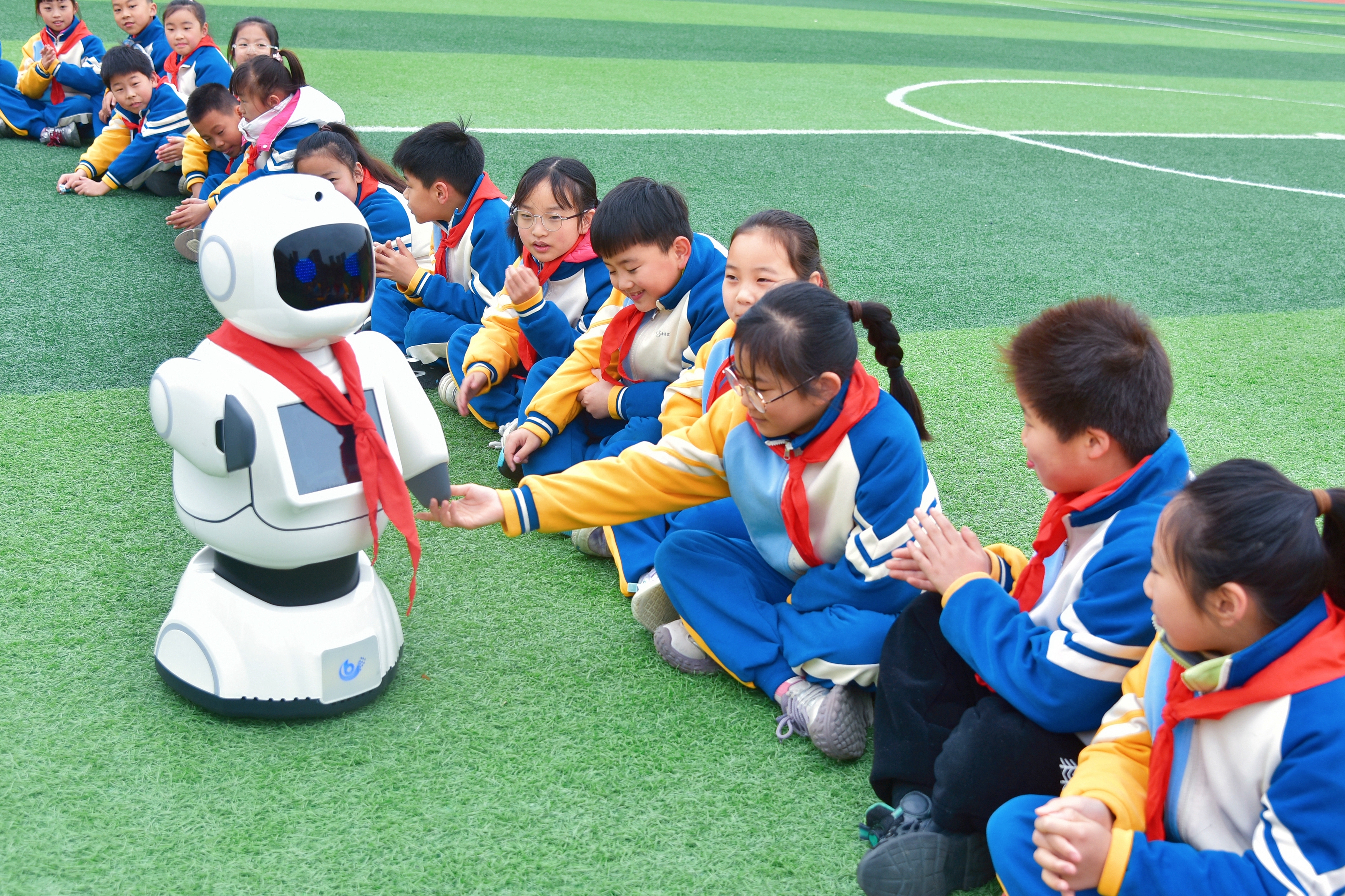 △2025年3月10日,江蘇南通,如皋經(jīng)濟技術開發(fā)區(qū)實驗小學課間,學生與智能機器人“賓果”互動。
