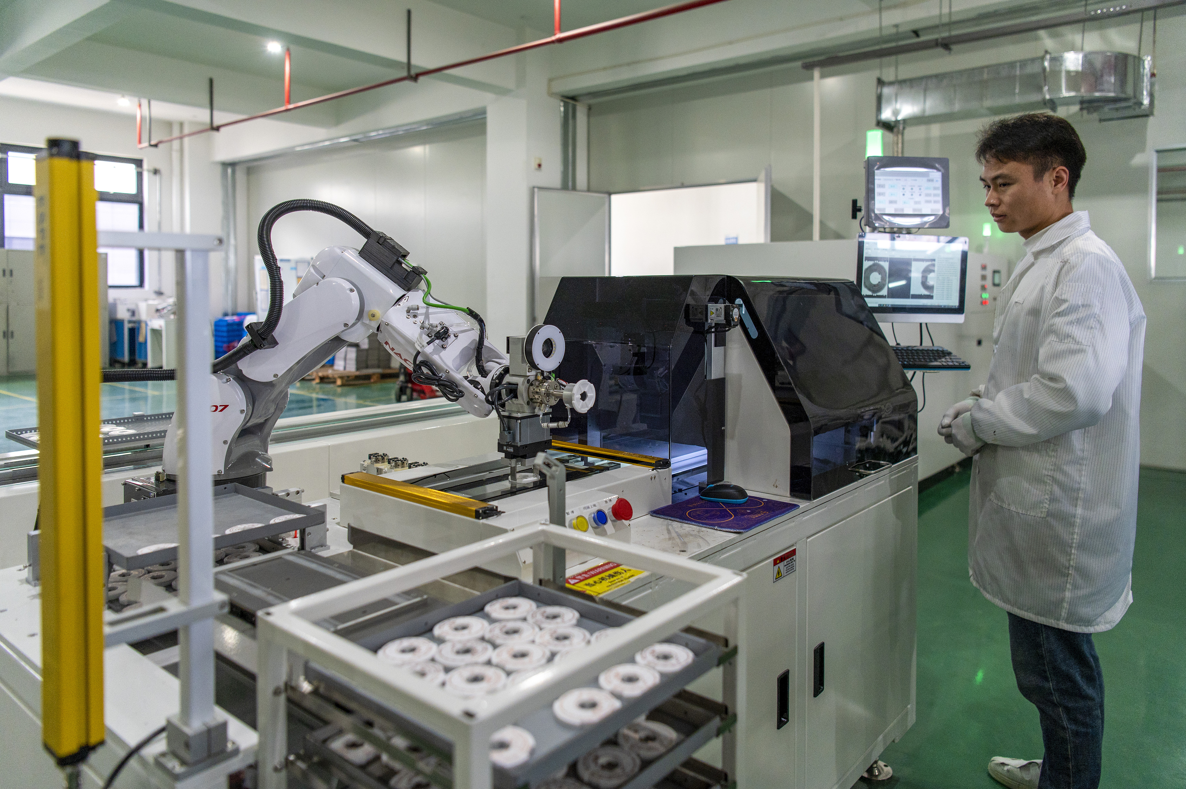 △2025年3月11日,在浙江省金華市浦江三思光電技術有限公司自動化生產(chǎn)線上,一只只機械臂靈活運轉著,趕訂單、忙生產(chǎn)。