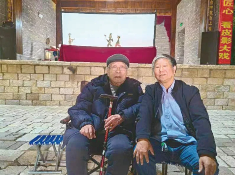 劉立新與“影戲箭桿王”齊永衡在皮影戲臺(tái)前合影。