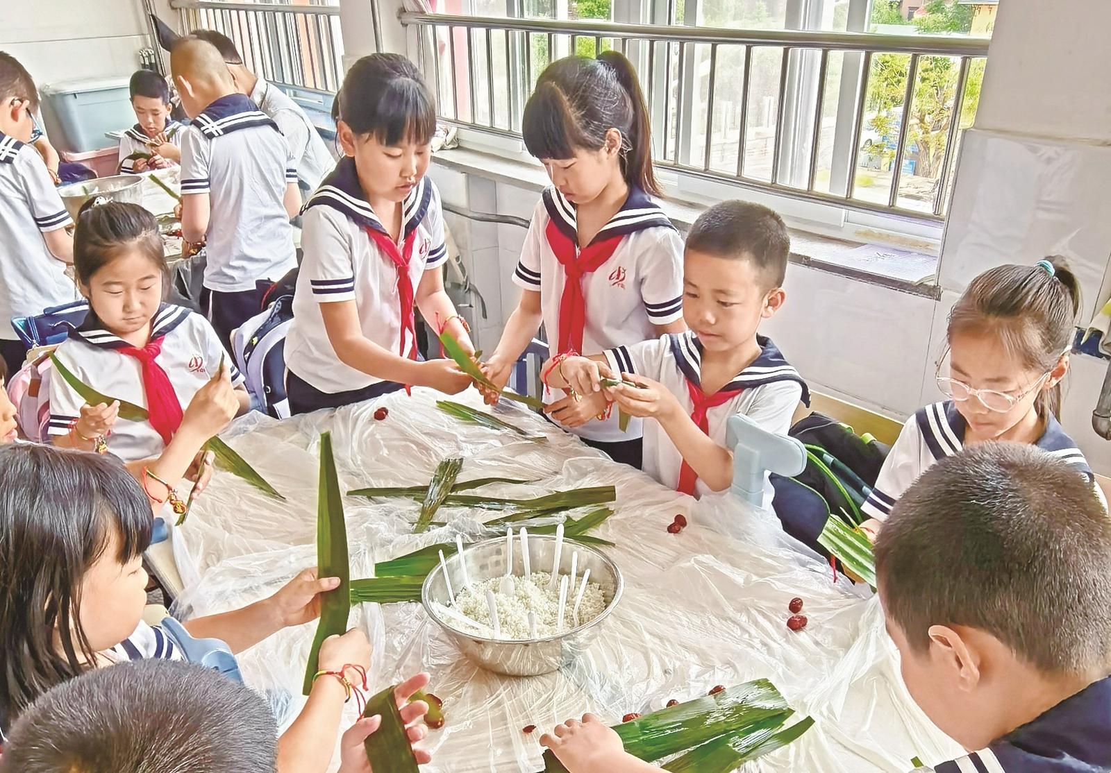 海港區(qū)迎秋里實驗學校的學生在老師的指導下學習包粽子。