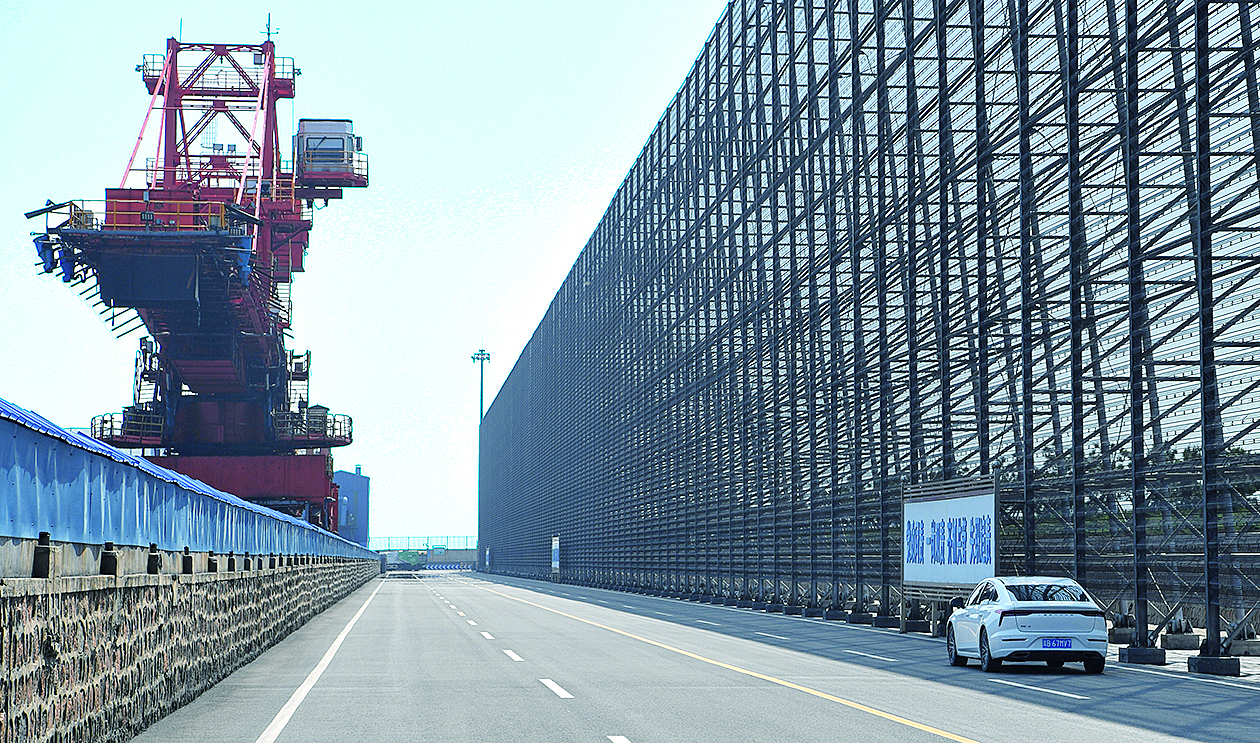 經(jīng)過封閉式皮帶運(yùn)輸,煤炭運(yùn)送到防風(fēng)網(wǎng)合圍的港口堆場(chǎng)。秦皇島港股份有限公司(以下簡(jiǎn)稱“秦港股份”)衛(wèi)生環(huán)保部高級(jí)經(jīng)理王帥介紹,港區(qū)的主要污染物是煤炭大顆粒物,為減少揚(yáng)塵擴(kuò)散,封閉式輸煤皮帶覆蓋全域,各個(gè)轉(zhuǎn)接點(diǎn)都有除塵設(shè)施。卸車機(jī)、堆料機(jī)、取料機(jī)等設(shè)備上的除塵系統(tǒng)隨設(shè)備同步運(yùn)轉(zhuǎn),與穿梭于堆場(chǎng)的智能灑水車、吸塵車共同防塵抑塵。另外,港口堆場(chǎng)的防風(fēng)網(wǎng)高23米、全長(zhǎng)9000余米,其設(shè)計(jì)經(jīng)過風(fēng)洞試驗(yàn),能有效降低堆場(chǎng)風(fēng)速,整體抑塵率可以達(dá)到95%以上。