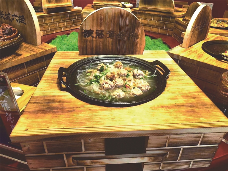 “鴛鴦陣”12人為一隊(duì),“戚家軍八大鍋”中,12粒丸子代表士兵,兩只大蝦似鴛鴦,蘿卜絲代表藤牌,竹筍代表狼筅,輔以山泉水小火慢燉,湯鮮味美,謂之“狼藤鴛鴦陣”。
