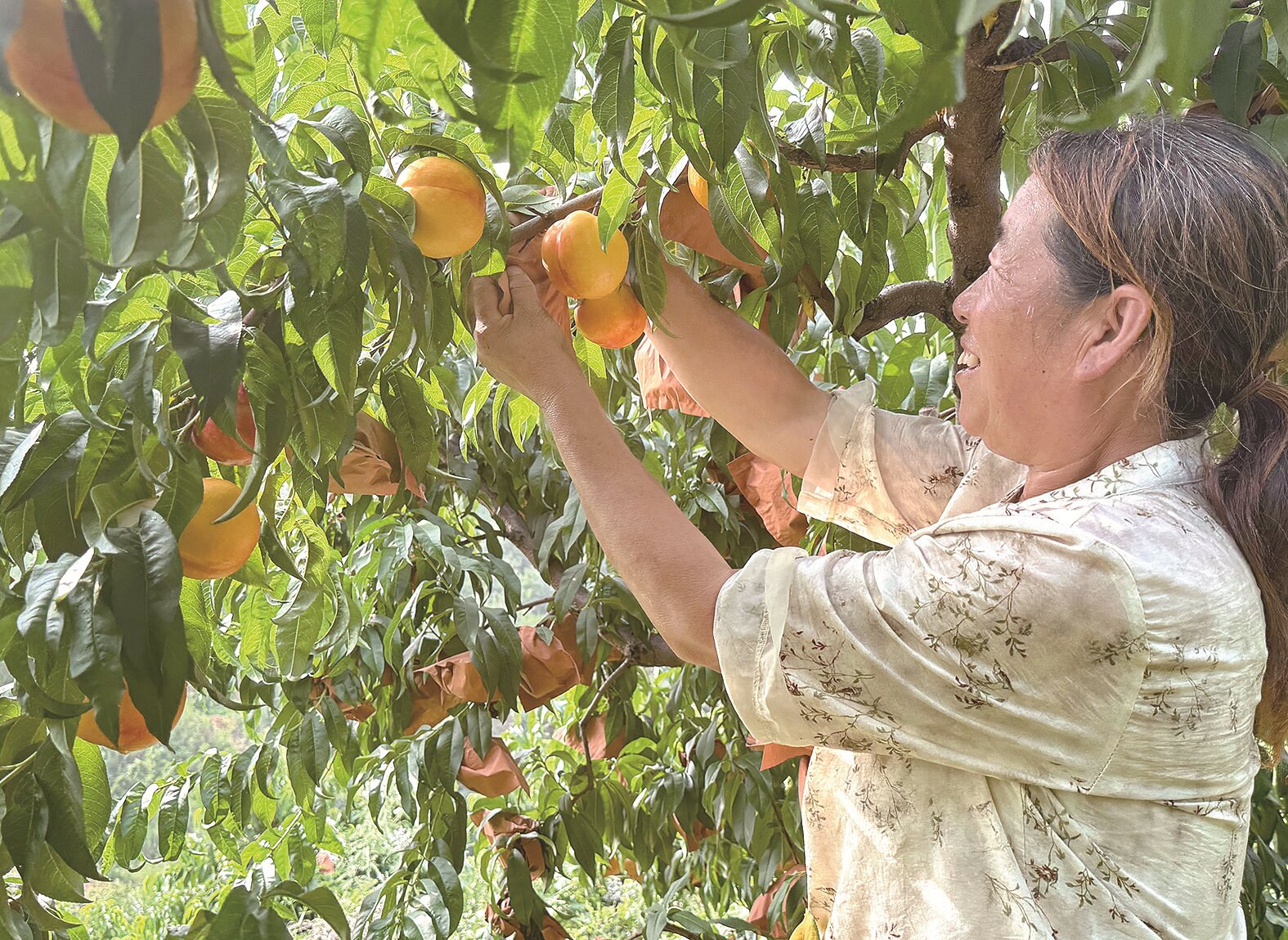 王漢溝農(nóng)戶正在采摘黃桃。 記者 陳立桐 攝
