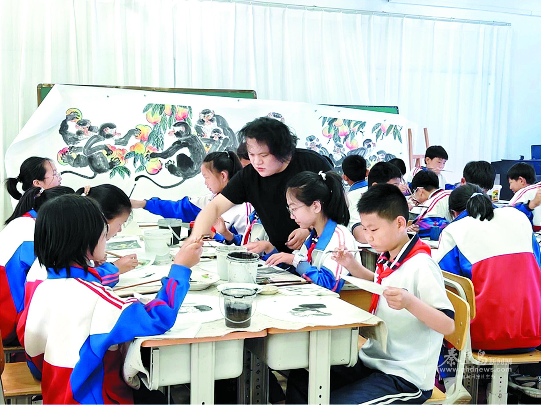 在畫社里,彭燁系統(tǒng)講授國畫、書法和篆刻等傳統(tǒng)藝術(shù)。隨著課程深入,一批有天賦的孩子漸漸嶄露頭角。她讓這些孩子當(dāng)“小老師”上臺示范,課間帶大家用畫筆美化校園墻面,把空白墻壁變成“童話森林”;課余時(shí)間組織孩子們布置展室,陳列“兒童生活水墨”“鄉(xiāng)土篆刻”等作品。
