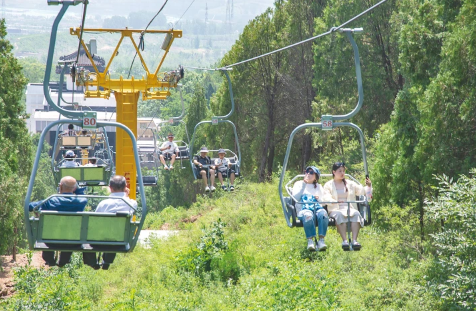 游客乘坐索道上山。