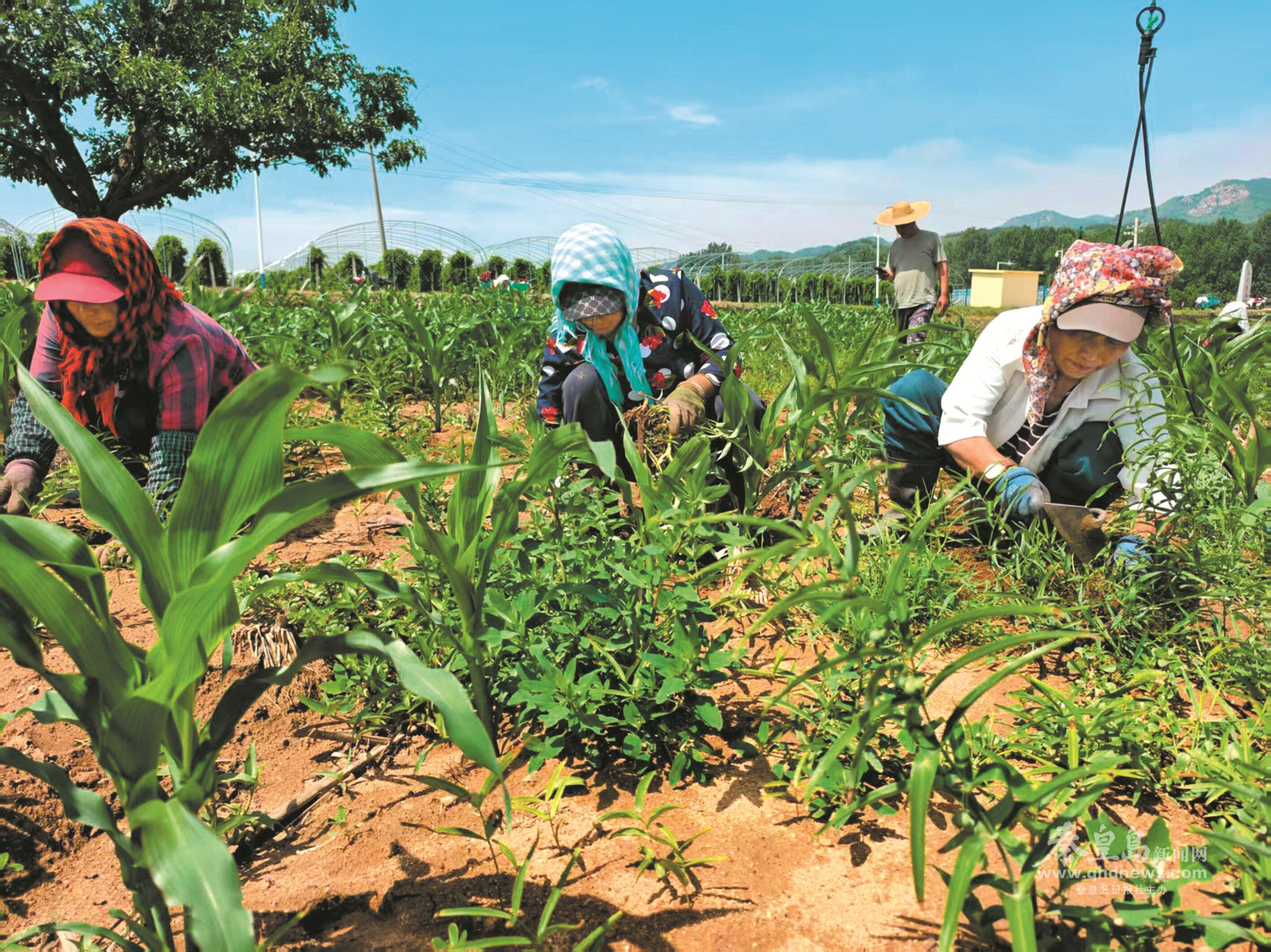 村民在中草藥種植基地除草。 記者 孟曉冬 攝