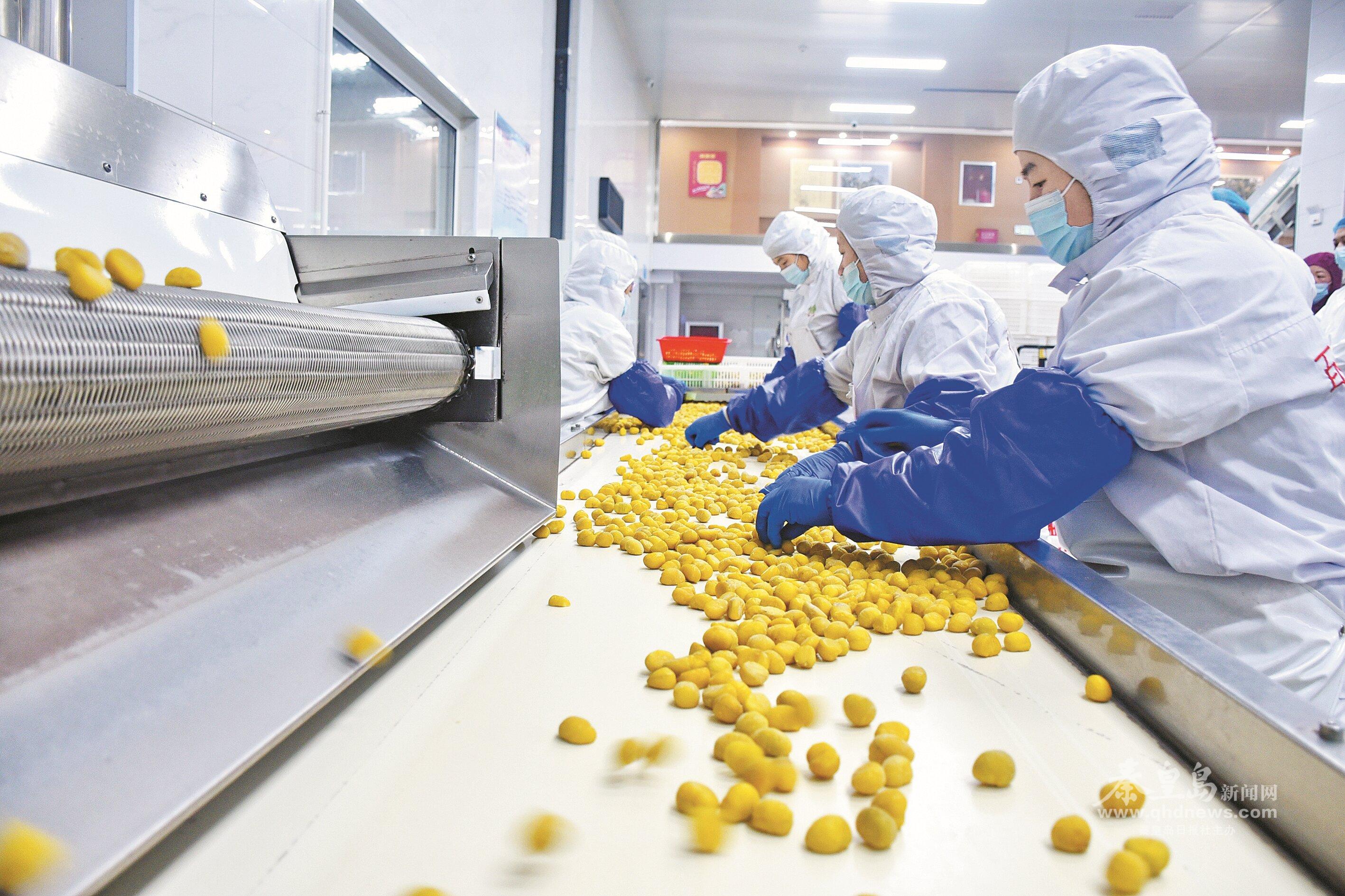 青龍滿族自治縣一家板栗加工企業(yè)的工人在生產(chǎn)線上作業(yè)。 秦皇島日報 記者 劉劍 攝