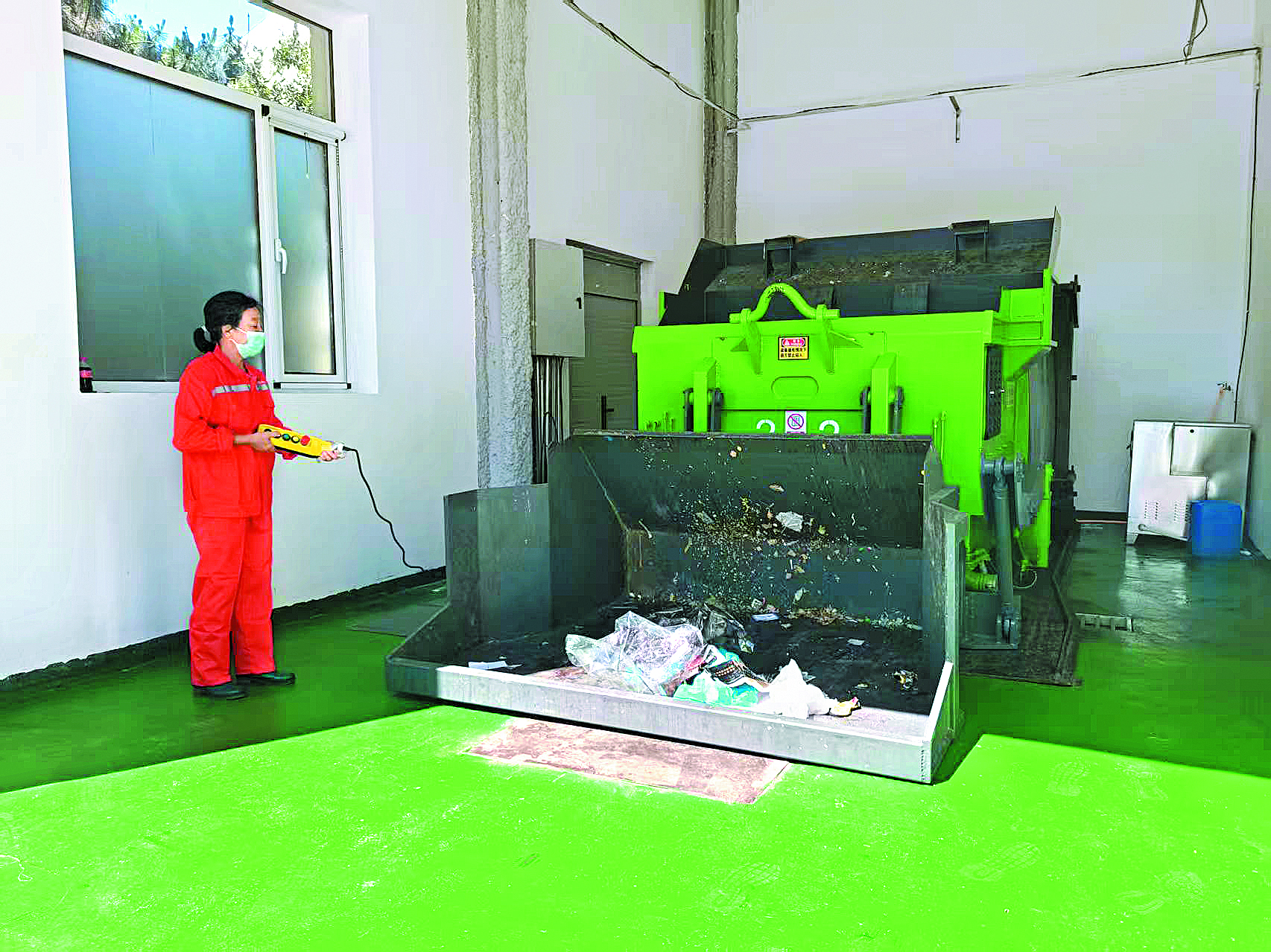 在北嶺辰光小區(qū)生活垃圾收集站內(nèi),工作人員正在操作壓縮式垃圾箱處理垃圾。 通訊員 劉放 攝