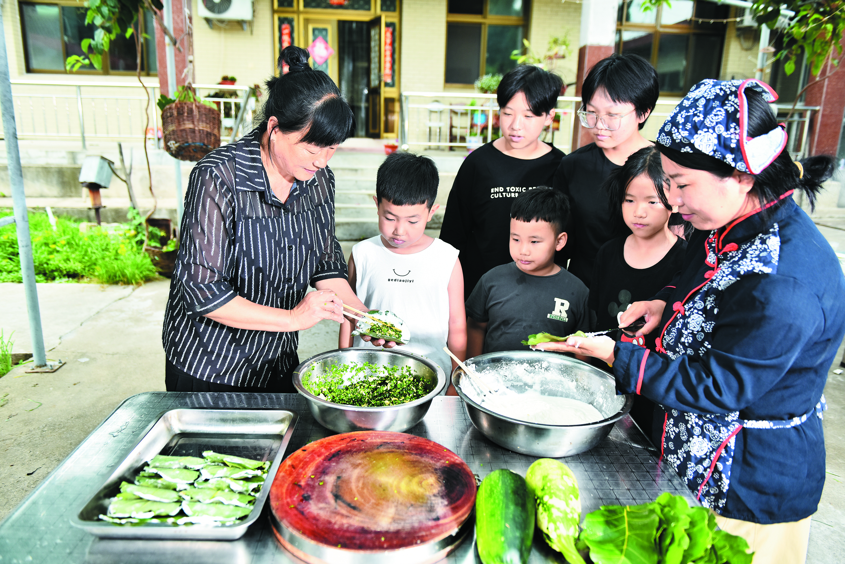 趙鳳鳴(左)在農(nóng)家院中教孩子們包桲欏葉餅。