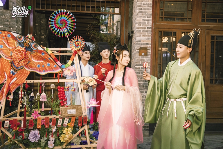 作為古城文化地標(biāo),西大街此次以“沉浸互動(dòng)”為核心,推出多元體驗(yàn)。10月1日至8日17:00-22:00,“雙節(jié)奇妙游”活動(dòng)持續(xù)上演。6大故事主演NPC身著宋代服飾穿梭街區(qū),與游客開展猜燈謎、學(xué)古禮等線下挑戰(zhàn),參與者可贏取可抵扣街區(qū)消費(fèi)的“銀票”?;顒?dòng)同步開啟線上直播,讓未到場(chǎng)市民也能“云游”古街。