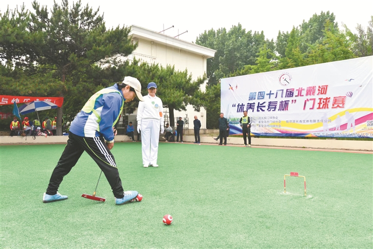 選手在第48屆北戴河休養(yǎng)長(zhǎng)壽杯門(mén)球賽中擊球。通訊員 吳宇濤 攝