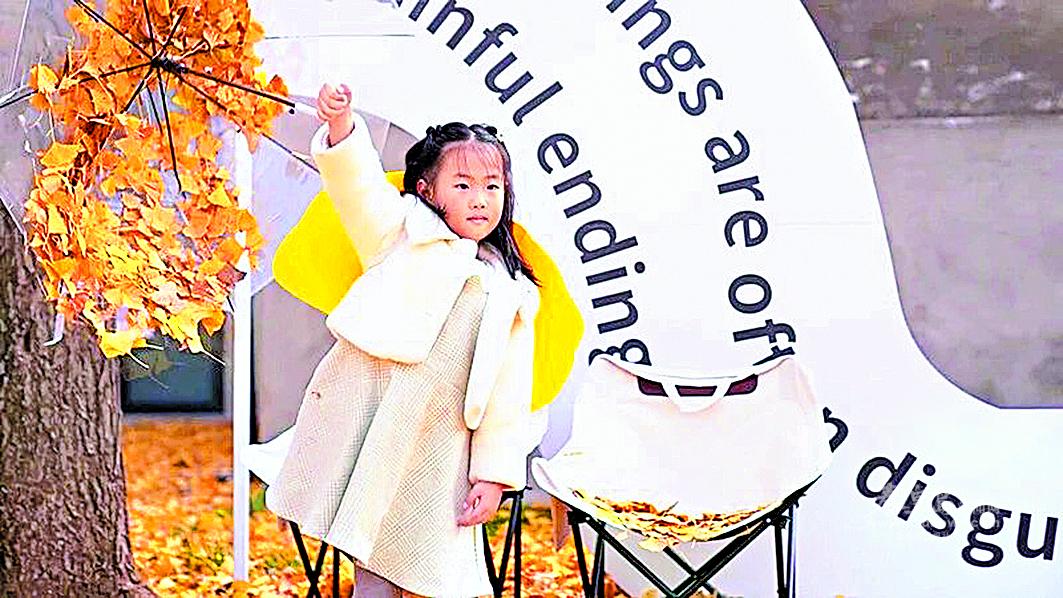 小朋友以銀杏葉為背景拍照留念。 通訊員 趙瑩 攝