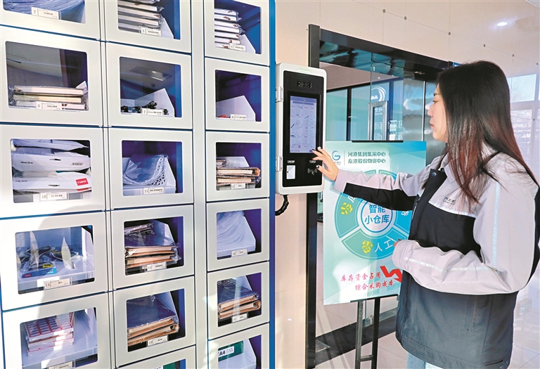 工作人員在智能倉儲柜領(lǐng)取辦公用品,“一鍵領(lǐng)用”模式取代了傳統(tǒng)申領(lǐng)流程。