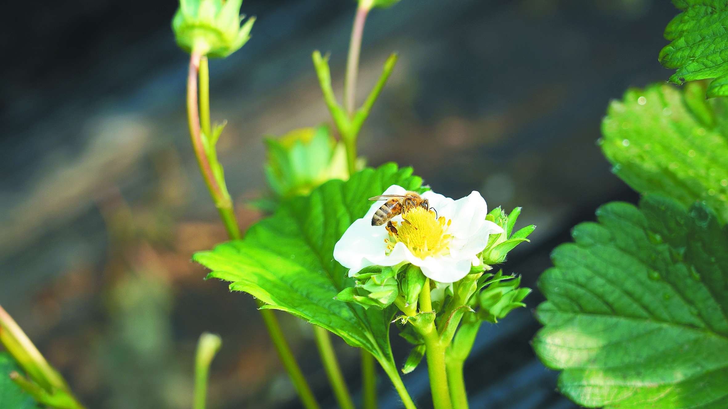 草莓花上忙碌的蜜蜂成了“天然質(zhì)檢員”。