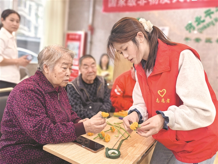 大學(xué)生志愿者教社區(qū)老人做手工。