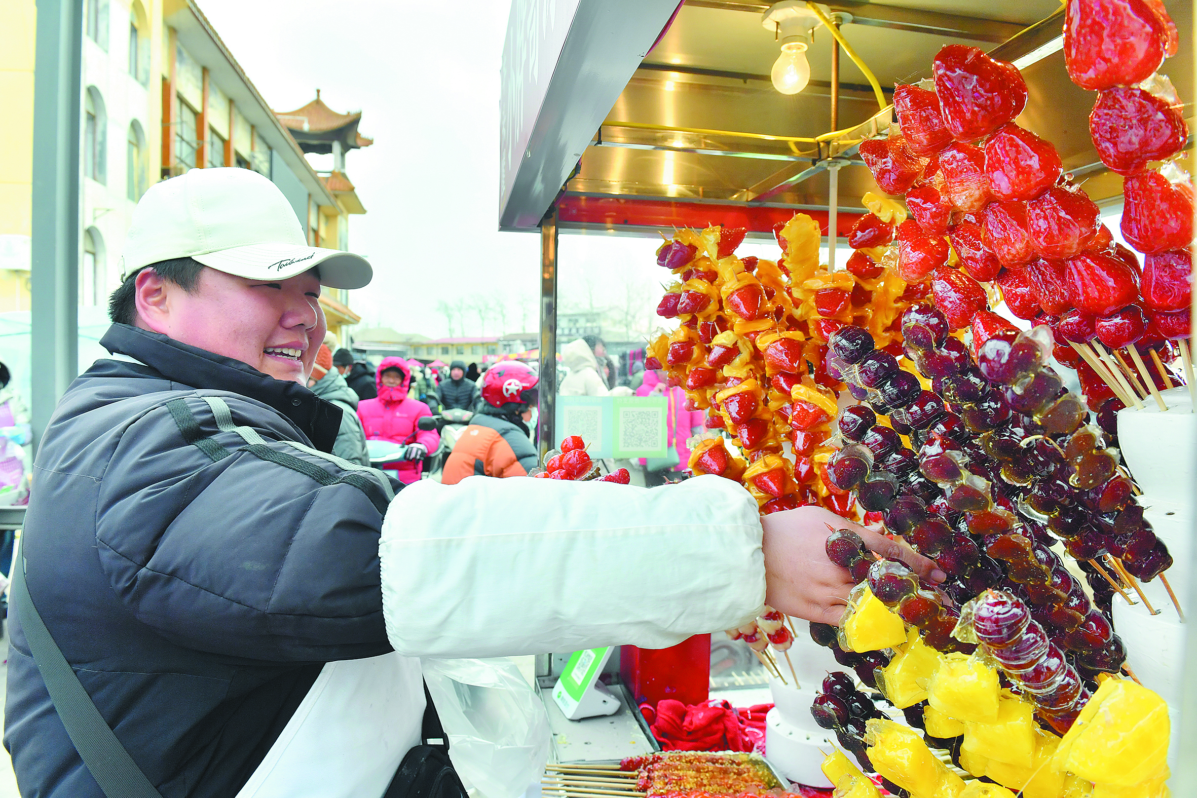 攤主笑著為顧客選取糖葫蘆。