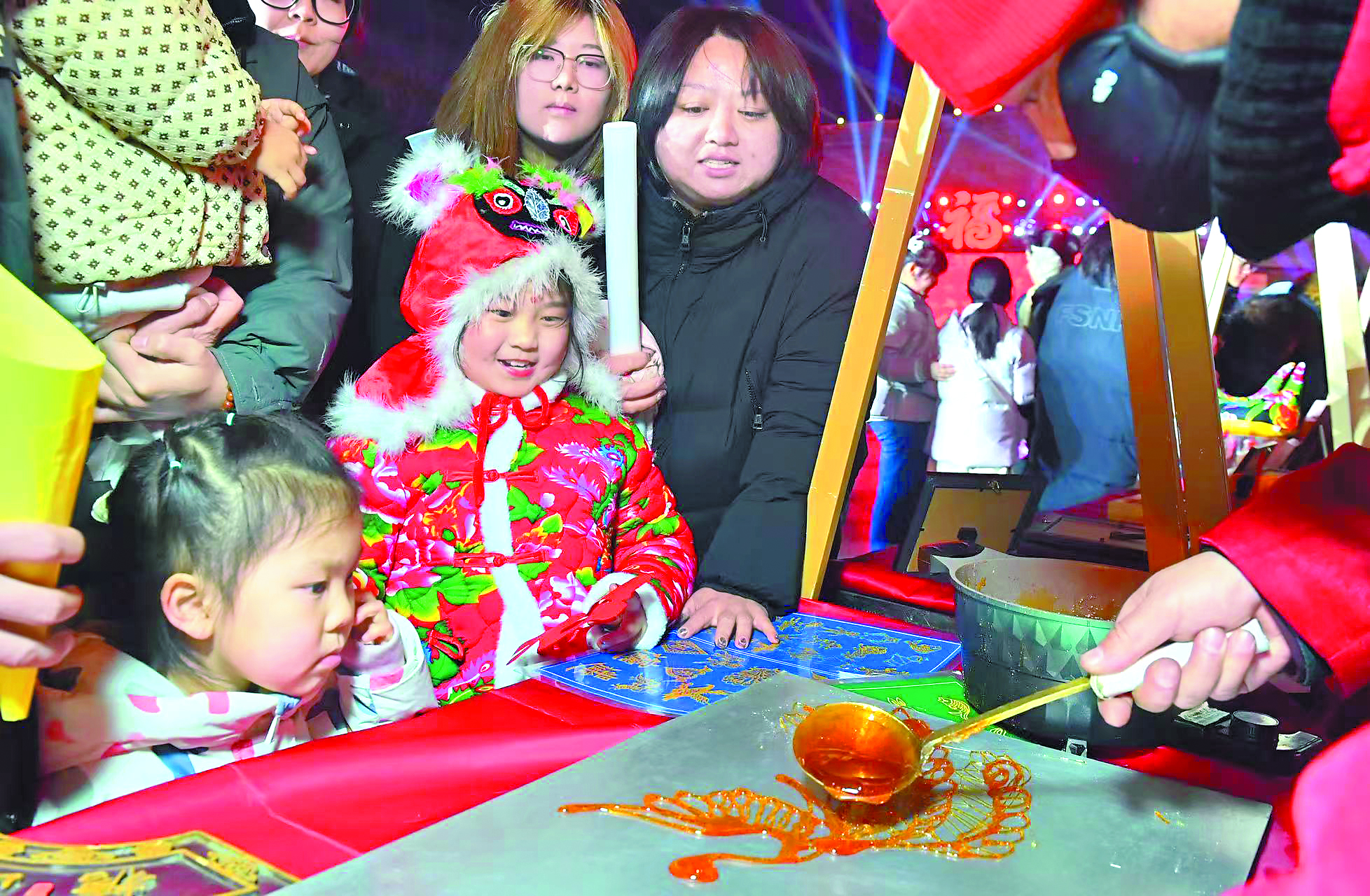 “食來運轉(zhuǎn)”攤位熱氣蒸騰,桲欏葉餅在蒸籠上冒著熱氣,酸菜白肉鍋咕嘟冒泡。關東胡同里,糖畫師傅腕轉(zhuǎn)靈活;吹糖人的師傅一鼓作氣吹出各種造型。游客手持參與互動NPC游戲贏來的“銀票”,在綜合美食街兌換一碗熱梨湯,湯水入口,甜美浸在舌喉。來自廣州的陳先生咬一口“驢打滾”,豆粉沾了滿嘴:“很甜很糯很好吃,像南方小吃,但又有北方特色和味道,是另一種感覺。”