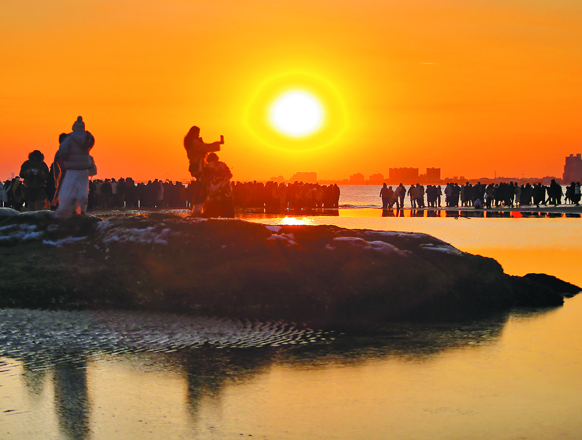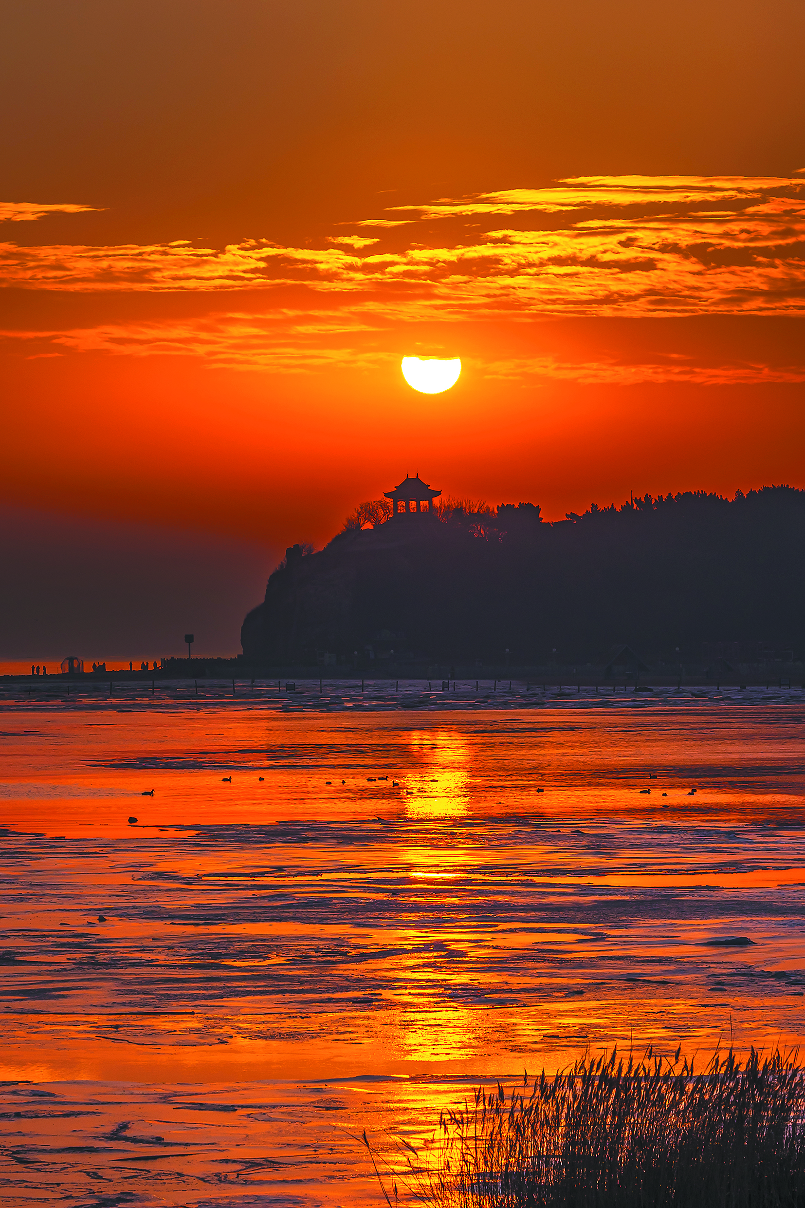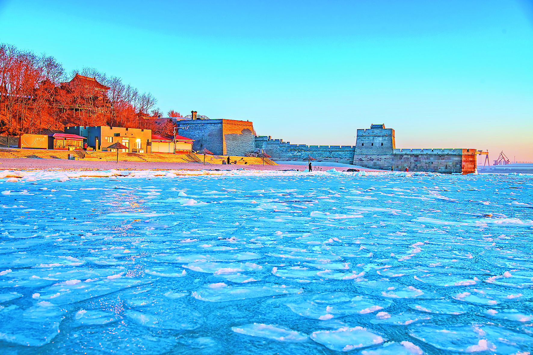 日出、日落時(shí)分,朝霞與夕陽(yáng)灑在海面上,形成如詩(shī)如畫的“橘子?!?;而在波浪和低溫的雙重作用下,海岸出現(xiàn)另一番奇特景觀“荷葉冰”。暖色的“橘子?!迸c冷色的“荷葉冰”交相輝映,共同扮靚了冬日里的秦皇島。