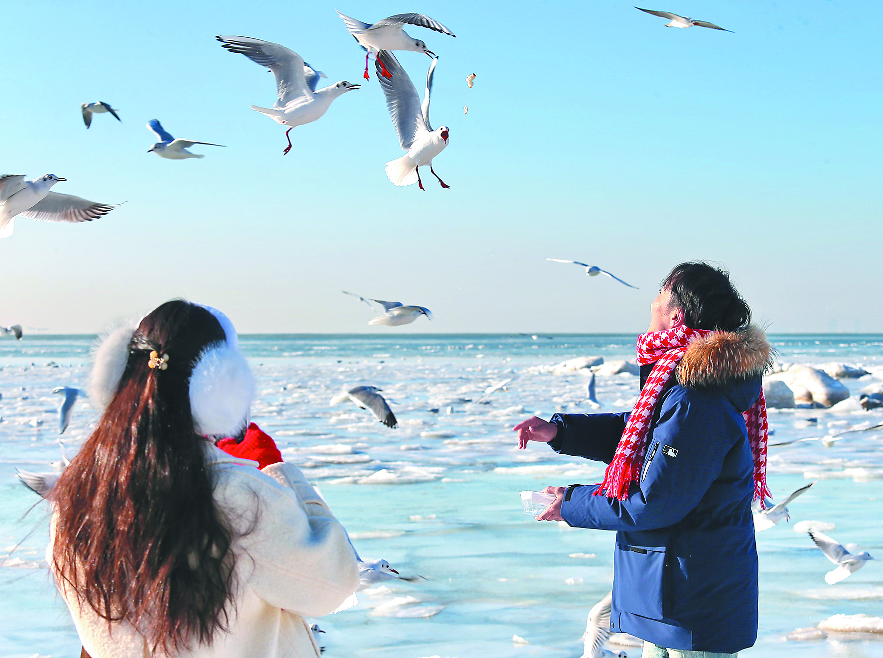 在老虎石海上公園,成千上萬(wàn)的海鷗盤旋于冰海之上,時(shí)而俯沖掠浪,時(shí)而棲落冰面,游客手持面包屑輕拋空中,海鷗如約而至,振翅、俯沖、啄食,動(dòng)作迅捷優(yōu)雅,清脆鳴叫與海浪拍冰的“咔嚓”聲交織,構(gòu)成冬日里獨(dú)有的自然交響。