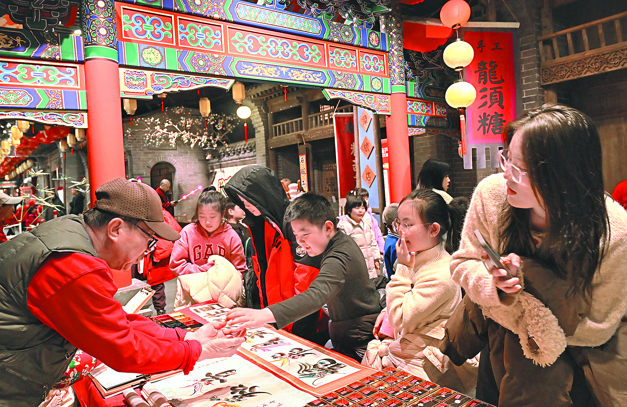 從2月上旬便開始的“非遺市集”依然受到游客熱捧。烙畫的木香、糖畫的甜香和皮影戲的鑼鼓聲、剪紙的剪刀聲交織在一起,洋溢著濃郁的年味兒。我市長城沿線非遺代表性項目傳承人都在市集現(xiàn)場駐場,“長城飯”“百味餃子”“木蘭桲欏葉餅”“青龍滿族黏餑餑”等長城沿線非遺美食,解鎖秦皇島最地道的傳統(tǒng)風味,現(xiàn)場不僅可買、可逛,更能深度體驗?!昂⒆硬粌H穿了漢服拍照打卡,還體驗了許多傳統(tǒng)手工項目,不僅玩得開心,還能提高對傳統(tǒng)文化的興趣,這種體驗比在家看視頻或者聽講解要生動得多?!迸阒⒆右黄饋砉洳┪镳^的市民陳媛說。