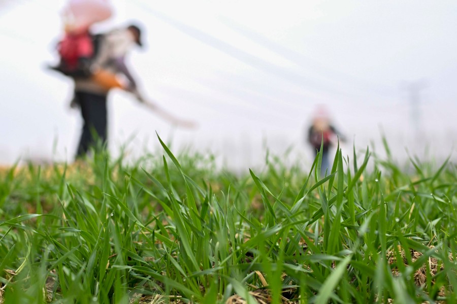 2026年2月4日,農(nóng)民在江蘇省昆山市錦溪鎮(zhèn)長(zhǎng)云村麥田間噴打化肥。新華社發(fā)(王須中 攝)