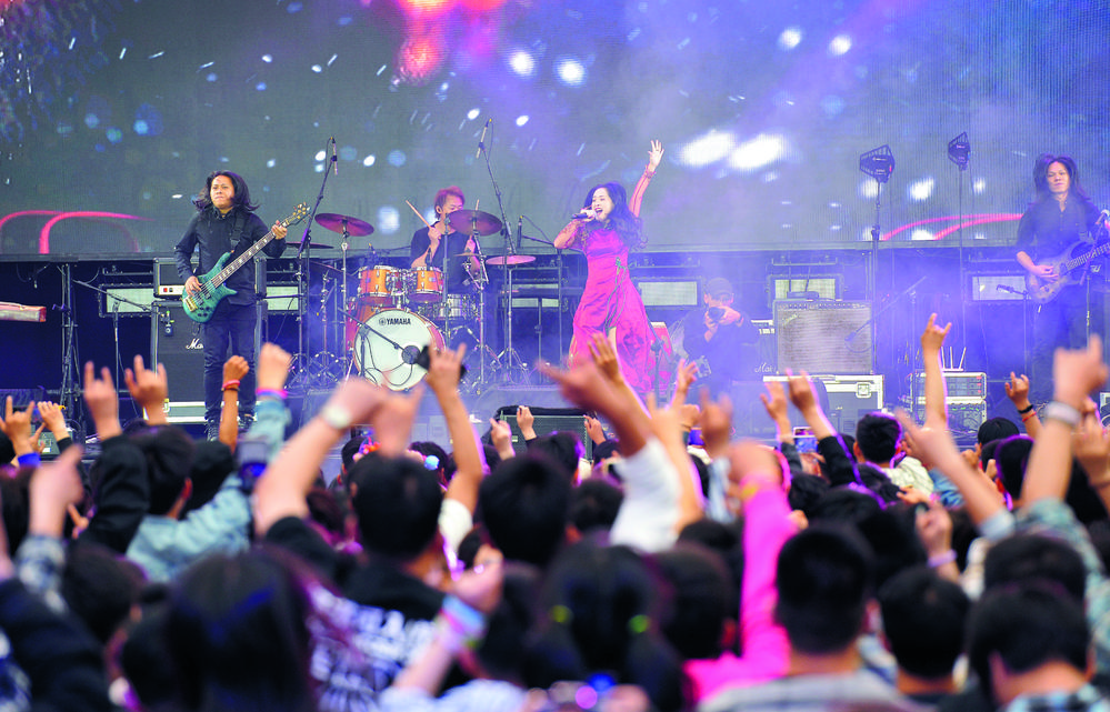 在石家莊工業(yè)遺址公園舉行的搖滾音樂節(jié)上,國內(nèi)眾多知名樂隊正在激情演唱。