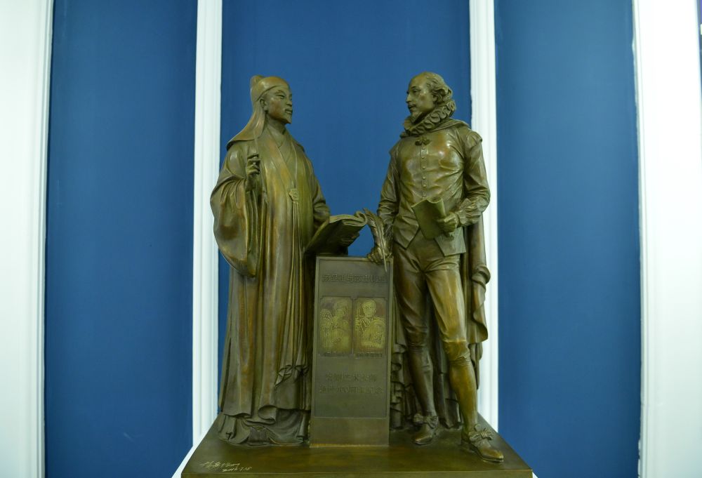 這是中國江西撫州湯顯祖紀(jì)念館陳列的湯顯祖遇見莎士比亞銅像(2016年10月12日攝)。新華社記者 周密 攝