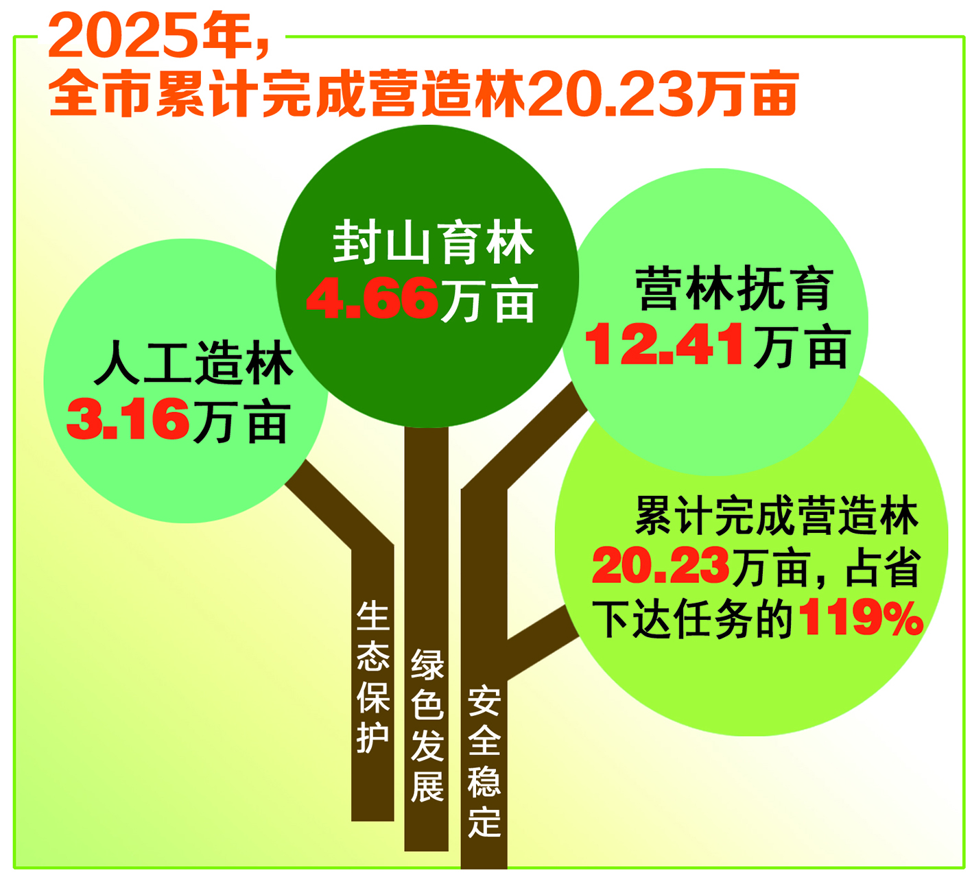 3月15日,記者在全市林業(yè)工作會議上獲悉,2025年,我市完成人工造林3.16萬畝,封山育林4.66萬畝,營林撫育12.41萬畝,累計完成營造林20.23萬畝,占省下達全年任務(wù)(17萬畝)的119%。